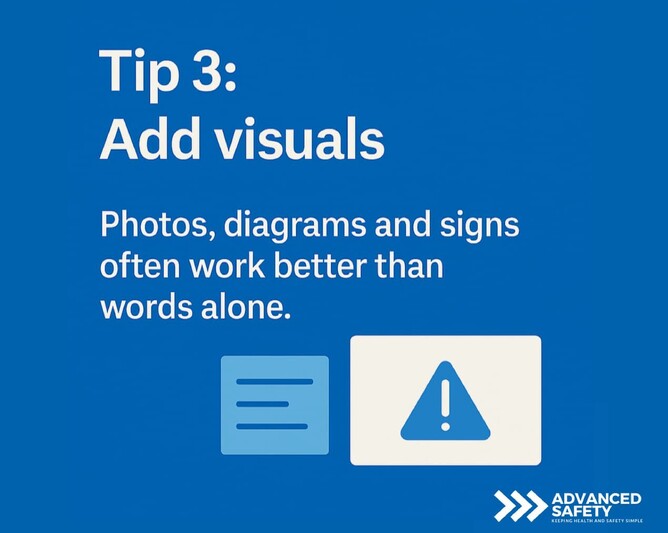 Try using icons, diagrams, step-by-step illustrations, or even short videos. A picture of correct PPE usage beats a paragraph describing it. A labelled diagram of a machine’s emergency stop button is far more effective than a line of text.